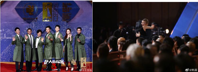 陈思诚和佟丽娅两人红毯各走各的,全程无交集,同场不同台,且无论是私下后台还是颁奖典礼现场,两人都似刻意保持距离一般。佟丽娅在后台忙着跟熟人合影,而陈思诚也全程照顾《唐人街探案》剧组,两人毫无交集。