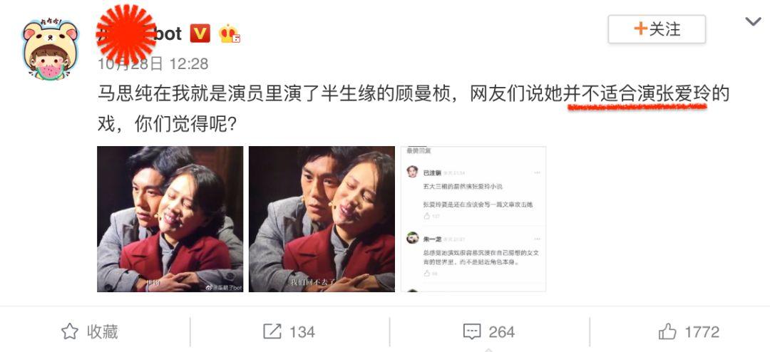 这是因为在最近刚播出的《我就是演员之巅峰对决》中,马思纯与秦昊搭档共同演绎经典影视剧《半生缘》,结果被批哭戏太尬,最终获得当期节目最后一名。清一色“不适合张爱玲”,但芒妈还是很期待她的《第一炉香》。