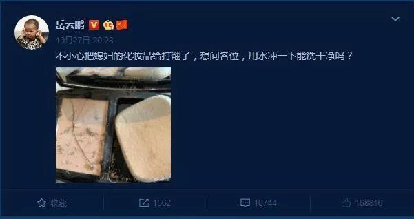 发现自己好心办了坏事,岳云鹏这个小机灵立马就发文展现了一波超强的求生欲:“不小心把媳妇的化妆品给打翻了,想问各位,用水冲一下能洗干净吗?”