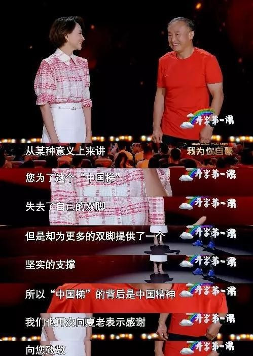 主持人董卿在节目上面说,“您为了这个‘中国梯’,失去了自己的双脚,但是却为更多的双脚提供了一个坚实的支撑”,这一个“坚持的支撑”就是“中国梯”。