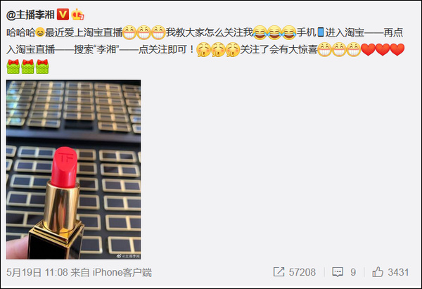 此后在@主播李湘 的微博中,经常可以看到各类产品的直播预告,那英、林依轮、赵薇和张庭在内的明星也纷纷出镜。