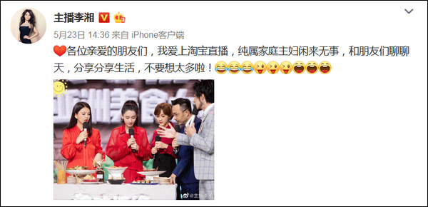 原来,随着电商直播的兴起,李湘也受到了影响。今年5月,她在微博宣布,自己爱上了直播,要加入直播带货的行列,并称做出这一选择的原因是“闲来无事,和朋友们聊聊天,分享生活”。