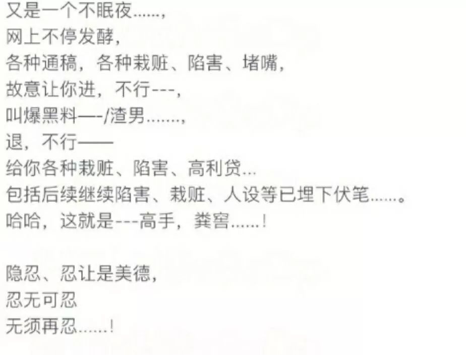 其中有一条微博是这样写的:“网上不停发酵,各种通告,各种栽赃、陷害、堵嘴、高利贷,包括后续继续陷害、栽赃、人设等已埋下伏笔。隐忍是美德,忍无可忍,再忍。”