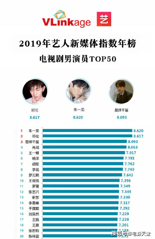 超越三位顶流位列前三的分别是第一朱一龙、第二邓伦、第三易烊千玺,毫无疑问都是圈里的知名演员。今年朱一龙一部《知否》、一部《我的真朋友》,邓伦一部《我的真朋友》、一部《海棠经雨胭脂透》以及易烊千玺的《长安十二时辰》都在网络上取得了不俗的成绩,尤其是《知否》更是提名白玉兰多项大奖,朱一龙的地位自然也是水涨船高。