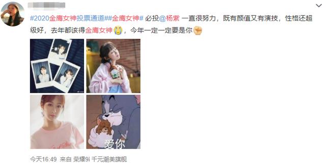 最后一个“隐藏条件”是“未婚”。刘亦菲、李小璐、王珞丹、刘诗诗、赵丽颖、唐嫣、迪丽热巴当选“金鹰女神”的时候都是还没结婚的时候。当年杨幂本来也是有机会当选的,因为太早结婚了,所以“失之交臂”,很可惜。对于这个“隐藏条件”,目前单身的杨紫肯定是完全符合的。