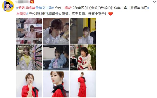 12月10日,在最新一届“华鼎奖”上,杨紫又凭借电视剧《亲爱的,热爱的》“佟年”一角拿下“当代题材电视剧最佳女演员”大奖。