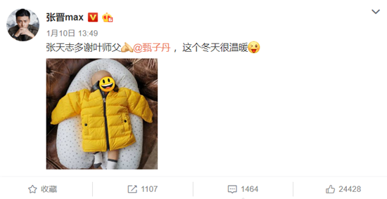 去年的11月15号,张晋的儿子出生,因为张晋的妻子蔡少芬也是明星,夫妻俩在娱乐圈的人缘应该很好。从他们儿子出生之后就在不断收到朋友们的礼物,都到了2020年了,他们的孩子还在收礼物。10号,张晋就在网上晒了一张儿子照片,穿的是甄子丹送的棉衣。张晋配文:张天志多谢叶师父甄子丹 ,这个冬天很温暖!