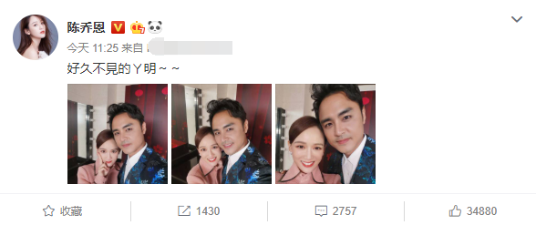 12月26日,陈乔恩晒出跟明道久违的同框照,照片中两人歪头亲密自拍,陈乔恩妆容精致,笑得非常开心。