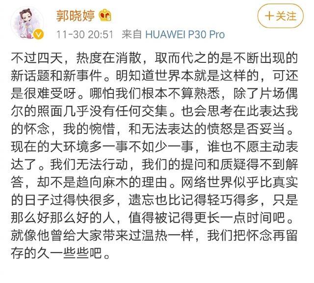 青年演员郭晓婷也为高以翔发文:不过四天,热度在消散,取而代之的是不断出现的新话题和新事件。我们无法行动,我们的提问和质疑得不到解答,却不是趋向麻木的理由。就像他曾给大家带来过温热一样,我们把怀念再留存的久一些吧。
