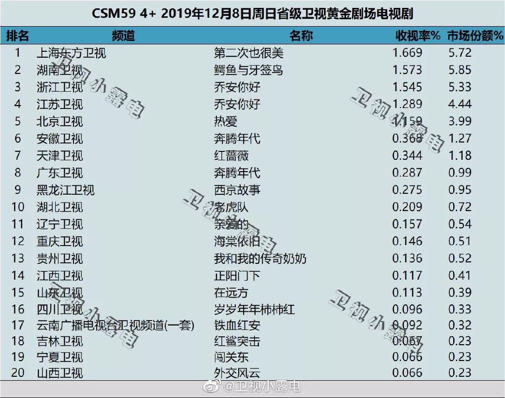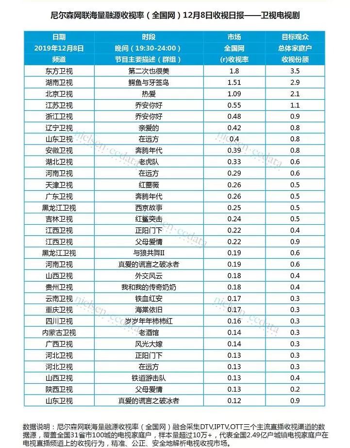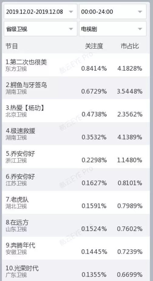 尼尔森网联和酷云互动的收视排名稍有不同。尼尔森网联海量融源收视率显示,《第二次也很美》和《鳄鱼与牙签鸟》的收视率均在1.5以上,《热爱》破1,但《乔安你好》的两台成绩都在0.5左右,与排在前面的剧集有有点差距。