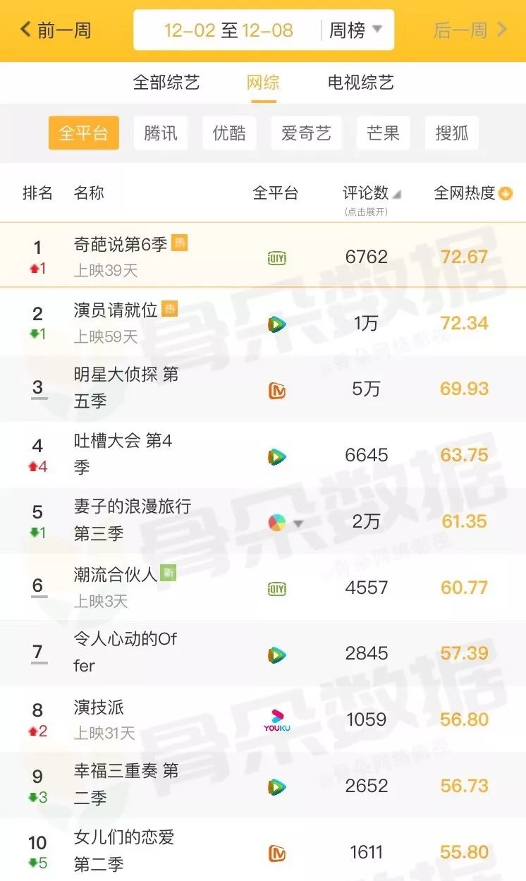 《奇葩说6》和《演员请就位》在热度和话题性上不相上下。前者新一季回归品牌的高水准,选手的晋级与淘汰、辩题的选择都牵动着网友的注意力;后者临近收官,却仍一直保持着开播以来有话题、有争议的高能状态。