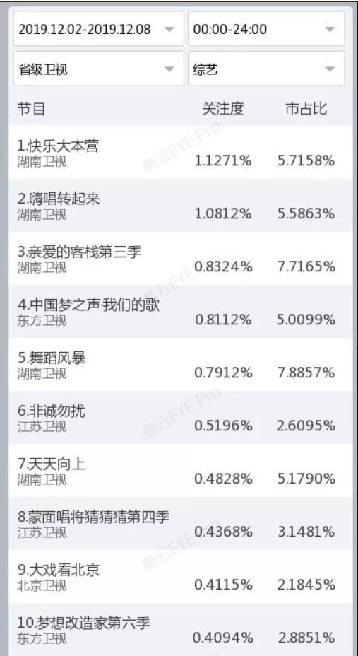 酷云直播关注度显示,《快乐大本营》和《嗨唱转起来》两档节目为上周仅有的两档关注度破1综艺。《亲爱的客栈3》和《中国梦之声我们的歌》在该测量仪中成绩不错,《巅峰对决我就是演员》和《跨界歌王4》则没有在该系统中的前十名出现。
