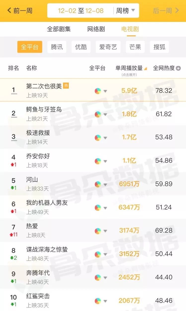 网播数据同样显示着《第二次也很美》的超强实力,周播量接近6亿,一骑绝尘,《鳄鱼与牙签鸟》位列第二。