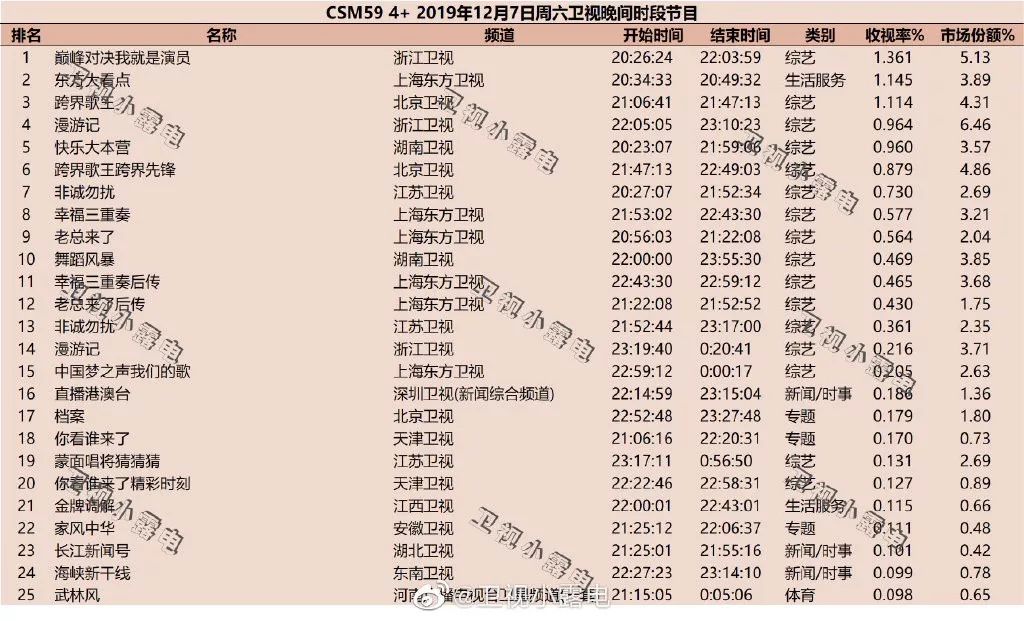 一改往日周六档节目多、高峰少的局面,上周六共有两档节目收视率破1。作为唯一一档在卫视播出的演技类综艺,进入下半季的《巅峰对决我就是演员》在电视受众中受到颇高关注,收视率达到1.36,比起更前一周成绩上涨超15%。另一档破1节目是北京卫视《跨界歌王》,在众多强势音乐综艺共同生长的环境下,该节目仍然在上周实现超20%的收视率增长。