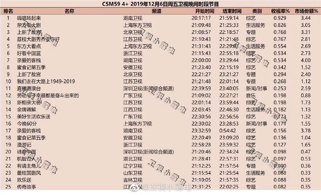 随着《追我吧》的永久停播,周五晚间具有强收视竞争力的节目数量也在减少。《嗨唱转起来》成为当日CSM59城收视率最高节目。《上新了·故宫2》上一期成功破1,而在上周节目中成绩稍有滑落,回到节目开播以来的平均水平。《亲爱的客栈3》上周收视上升,进阶到0.5以上。