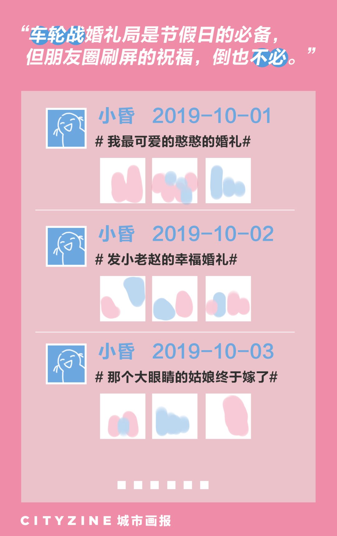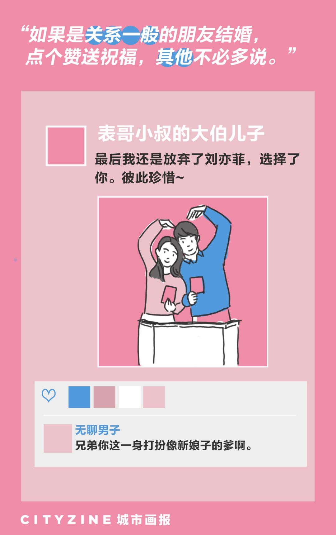 以上毒舌归毒舌,城画君还是想说:虽然大家都希望结婚时展现出自己最完美的一面,也渴望通过朋友圈来保持和社交圈的良性互动,但“包袱”过重、规则过多也容易让人心累。所以不如互相都放松一些吧!