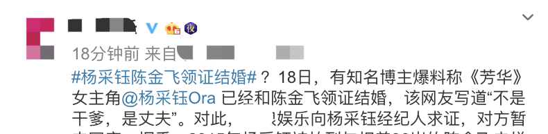 12月18日下午,有媒体爆料称疑似《芳华》主演杨采钰已经和男友陈金飞领证结婚,消息一出瞬间引发热议。