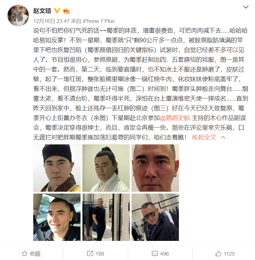 好不容易再次成为话题中心的人物,赵文瑄在被各种网友感叹的同时,也是按捺不住潜水的心,随后,他马上在微博上发表了好几条动态,根据自己发胖的问题来回分析、吐槽,虽然还是跟当年一样幽默的语气,但现在的他,心气却好了很多,甚至面对一些网友的恶评,他也可以保持一笑置之了。