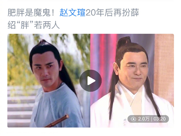 前几天,赵文瑄受邀参加某综艺节目,在节目中,他再次身穿戏服重现了当年的薛绍一角,虽然与20年前对比,赵文瑄的五官除了多了些皱纹并无太大明显变化,但问题在于,他却也发福了20公斤,因此,许多网友在感叹的同时,也是纷纷拿出之前的剧照拿来对比,差距也是十分明显。