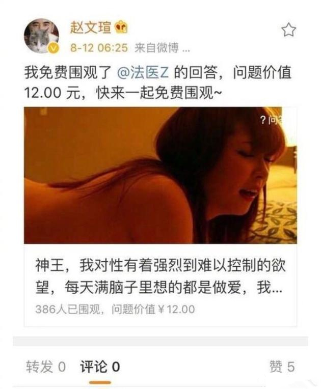 2017年,赵文瑄在微博问答中围观了问题“我对性有强烈到难以控制的欲望,每天满脑子都是。。。。。。”,随后不小心分享到了微博上,立即秒删。虽然赵文瑄秒删微博,但还是有网友截屏为证。