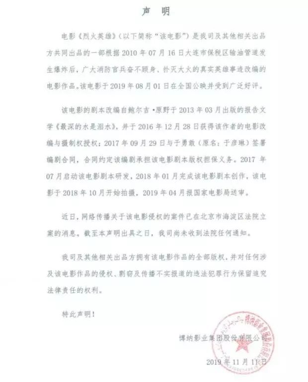 11月11日,博纳影业就电影《烈火英雄》因涉抄袭被起诉一事发表声明,称影片剧本改编自鲍尔吉·原野2013年出版的报告文学《最深的水是泪水》,2016年12月合法获得改编与摄制权授权,公司及相关出品方拥有该作品全部版权。关于法院立案的消息,截至声明出具之日,公司尚未收到法院任何通知。
