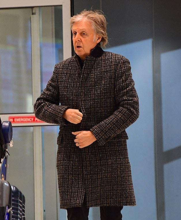 从飞机上的手机录像来看,保罗·麦卡特尼则选择了全黑的T恤与裤子。不过在飞机着陆后,他则披上了一件带有密勃艮第格子图案的精致外套。