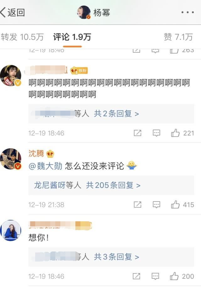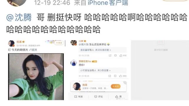 12月19日,杨幂在微博公开了一张正面照,粉丝纷纷留言大赞她漂亮,没想到了这个时候,评论区来了一位不速之客——沈腾。