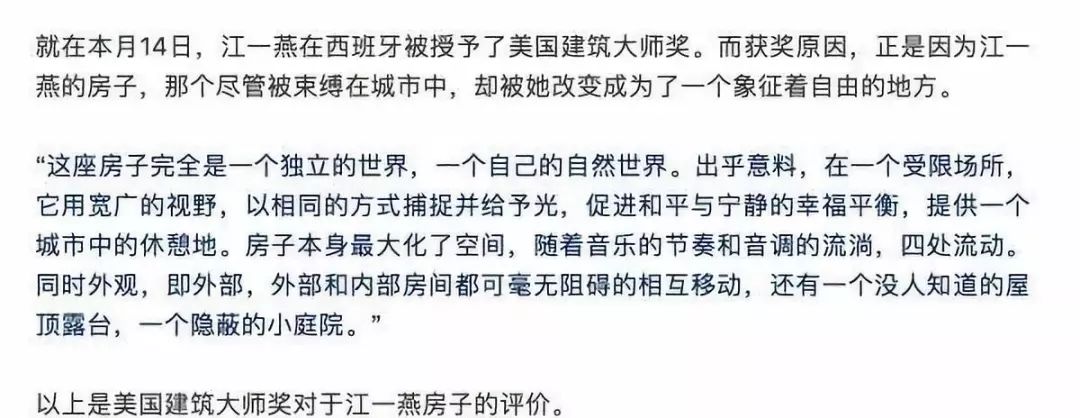 很明显,“房子作为作品获奖”,和“江一燕本人获奖”的说法,