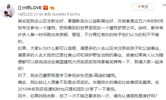 一时间,文青演员江一燕在建筑设计领域取得巨大成功的消息铺天盖地: