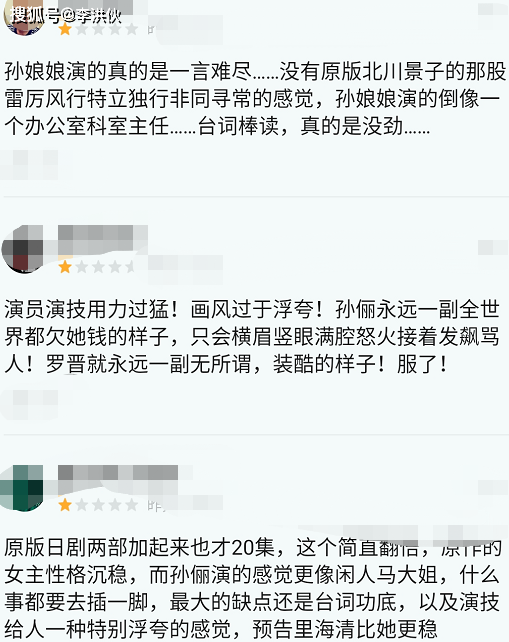 《安家》作为孙俪的首部职场剧作,可以说是未播先火,然而剧集播出后,不少人对孙俪的表现颇为不满,纷纷打低分回应。许多人吐槽孙俪的演技问题,直指她的演技一言难尽,将门店店长演出了办公室主任的样子,像是全世界欠她钱,还称她是娘娘附体了,为刻意突出气场而面无表情。
