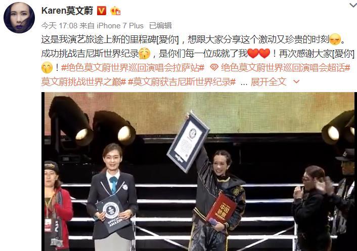 在12日莫文蔚拉萨演唱会结束之前,吉尼斯认证官上台为莫文蔚颁发了认证,也因此将全场情绪推至最高潮,莫文蔚本人则是在隔天评价说“这是自己演艺旅途中新的里程碑”。但在大众视角中看来,莫文蔚获得吉尼斯世界纪录,固然是天后光环再涂上浓重一笔,但不也同样算是为国争光了吗?