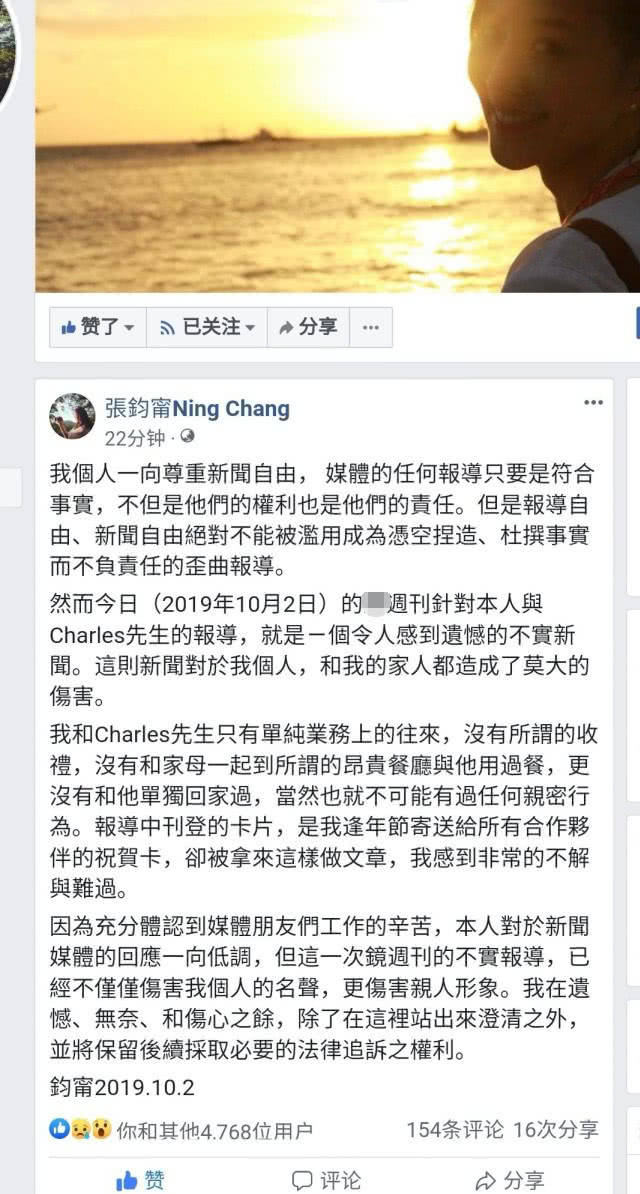 张钧甯的经纪公司发声明反击,强调报道所说的都不是事实,将保留法律追诉权。