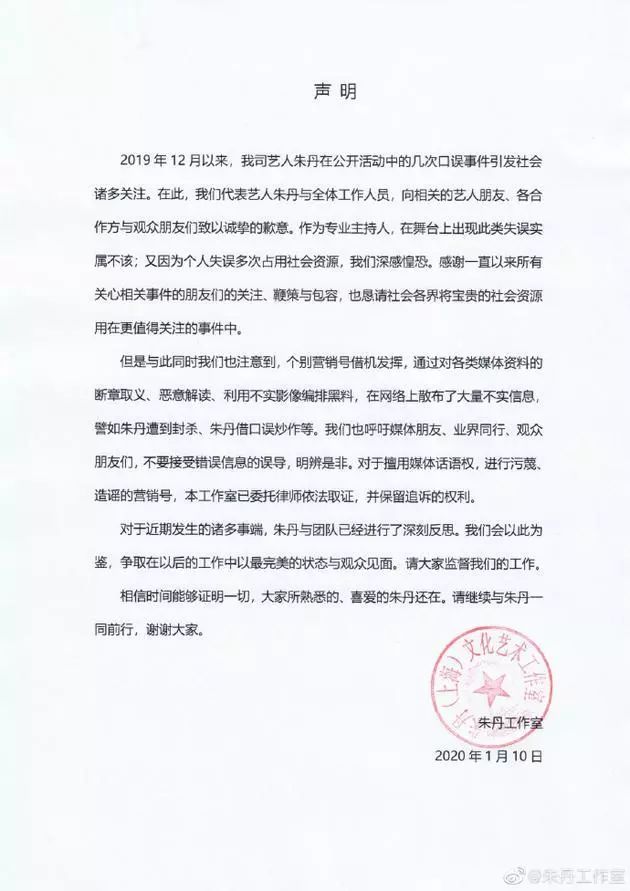 1月10日,朱丹工作室发表声明,针对朱丹在公开活动中几次口误引发大家关注的事件,表达歉意,感谢大家的关心和鞭策。但是个别营销号借机发挥,断章取义、恶意解读、散布大量不实信息的行为,律师已依法取证,并保留追诉权利。