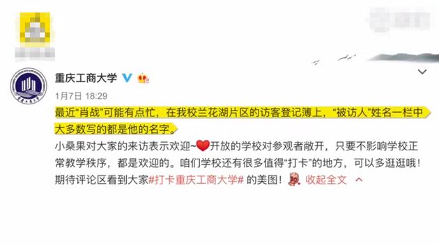 近日,肖战粉丝频现重庆工商大学兰花湖校区打卡肖战母校。学校的访客登记簿上“被访人”一栏也全是肖战,学校官博和学生表欢迎。
