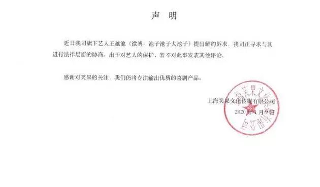 1月10日,笑果文化发CEO发声明,表示池子近日提出解约诉求,公司正寻求与其进行法律层面的协商,并表示出于对艺人的保护,暂时不对此事发表评论。