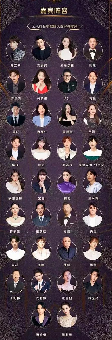 先上一串嘉宾名单:肖战、李现、王一博、朱一龙、易烊千玺、吴亦凡、杨洋、杨紫、迪丽热巴、郑爽、周冬雨、杨幂、关晓彤、Angelababy、欧阳娜娜。