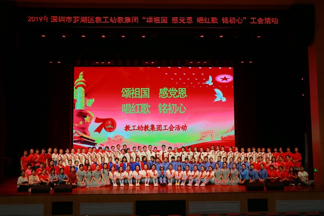 为庆祝中华人民共和国成立70周年,重温红色经典,弘扬爱国精神,同时进一步增进教职工感情和家、园联系,推动校园文化建设,9月30日,深圳市罗湖区教工幼教集团在深圳市第二实验学校高中部礼堂开展了“颂祖国 感党恩 唱红歌 铭初心”的庆祝活动,通过歌咏比赛展教工风采,颂祖国华章。