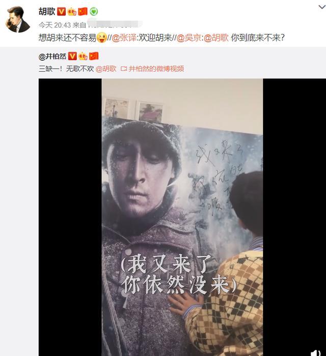 原来,吴京和井柏然参加了《攀登者》的一个活动,但是胡歌却没有来。吴京就在胡歌的海报上写上了四个字:他还没来!吴京的表情非常滑稽好玩。随后,井柏然也在胡歌的海报上写了几个字:我又来了,你依然没来。