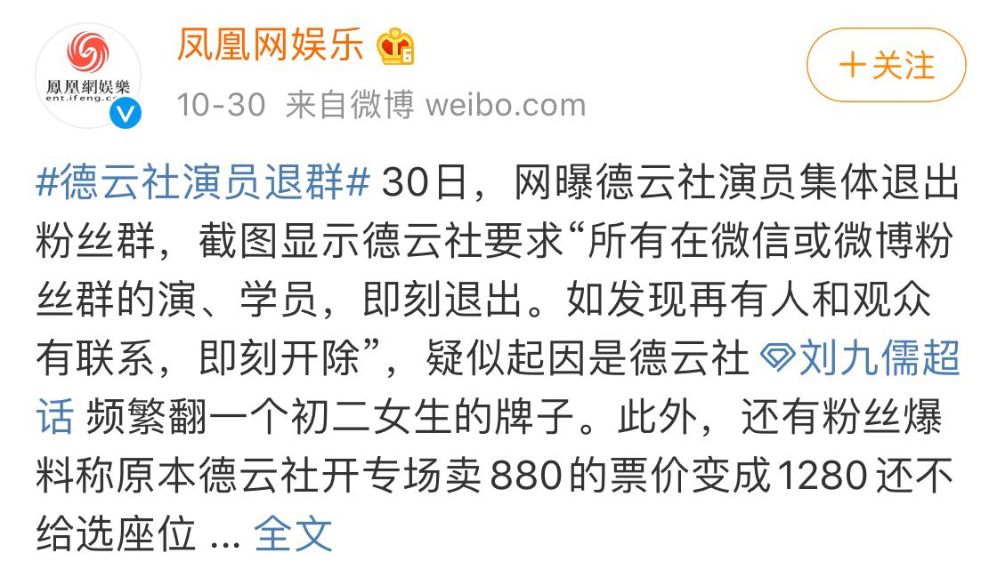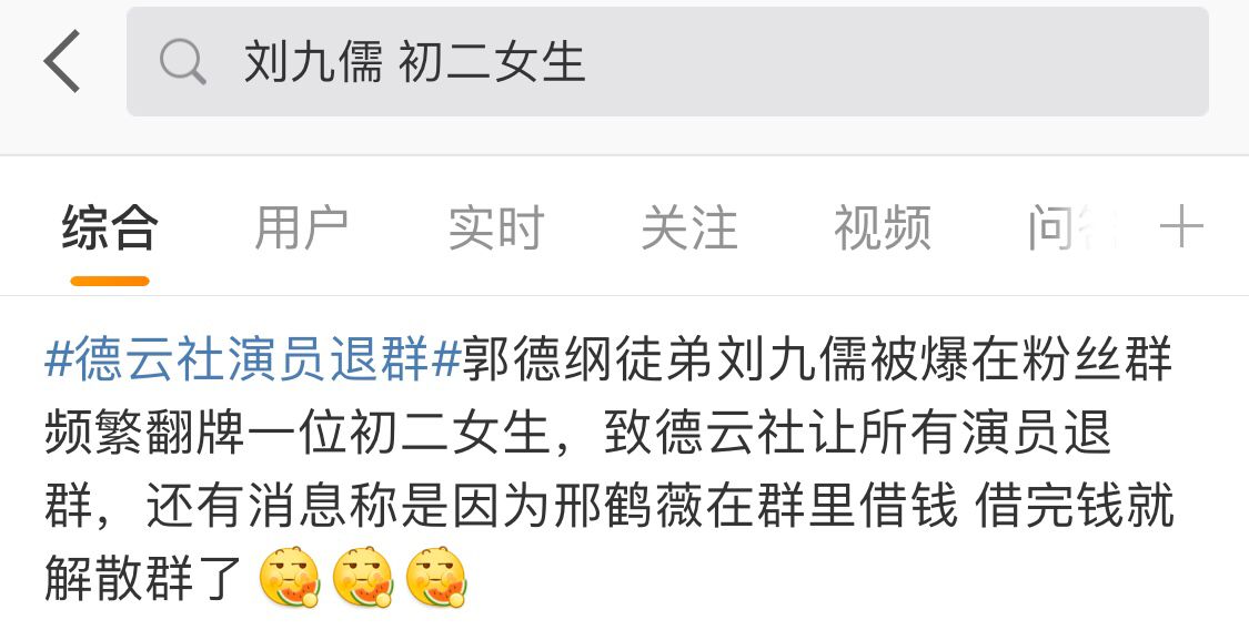 没错,这个爆料出来后,骂德云社、郭德纲、刘九儒的大有人在。尤其是很多网友纷纷为所谓的“初二女生”打抱不平。一时间,德云社再次成了口诛笔伐的对象,也再次被推上了风口浪尖。