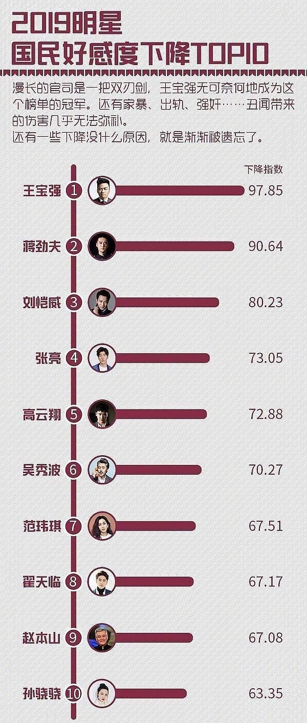 其中,2019年明星国民好感度下降TOP10榜单最惹人关注,毕竟,无论是蒋劲夫、高云翔、吴秀波还是翟天临等人,都在2019年或多或少因为“黑历史”而陷入网络舆论中,不过,这份榜单在受到认可的同时,也多少引起了一些争议。