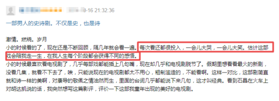 网友坦言,这部剧看得一会笑一会哭,估计是一辈子都会难忘的经典大剧,并在这部剧中得到了人生不同阶段的感悟。
