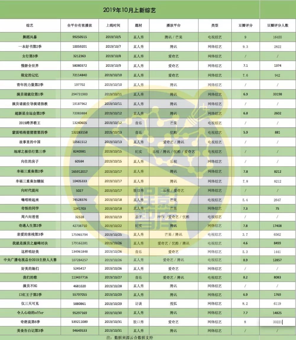 对比10月份在上线数量上有所缩水,网台综艺一起,衍生综艺也算在内一共只有18档。但好在有几档备受瞩目的“综N代”定档本月,可以撑下场面。