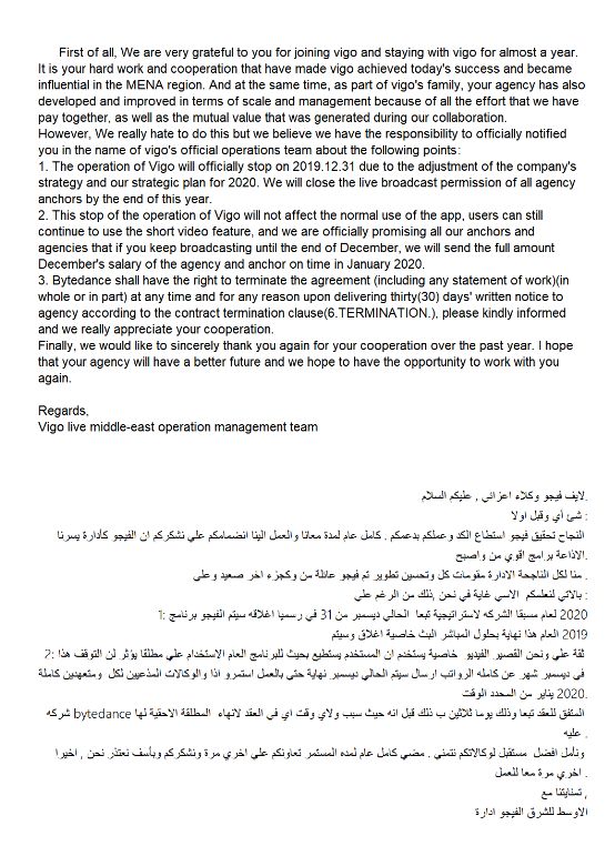 12月14日,火山小视频海外版Vigo Video中东运营团队发布公告,在中东市场进行一年多尝试后,该平台已定于2019年12月31日正式停止运营,并关闭所有公会主播的直播权限。