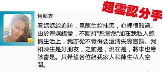 但这段陈山聪以离婚、和朋友决裂换来的感情却并没有维持太久,到了13年,何超云便在网上公布分手消息,两人两年情就此玩完。