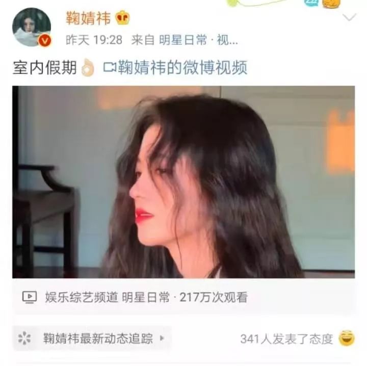 在家呆久了难免无聊,鞠婧祎绝对是一个合格的偶像了,这个时候也不忘拍视频出来营业,发博配文:“室内假期”。