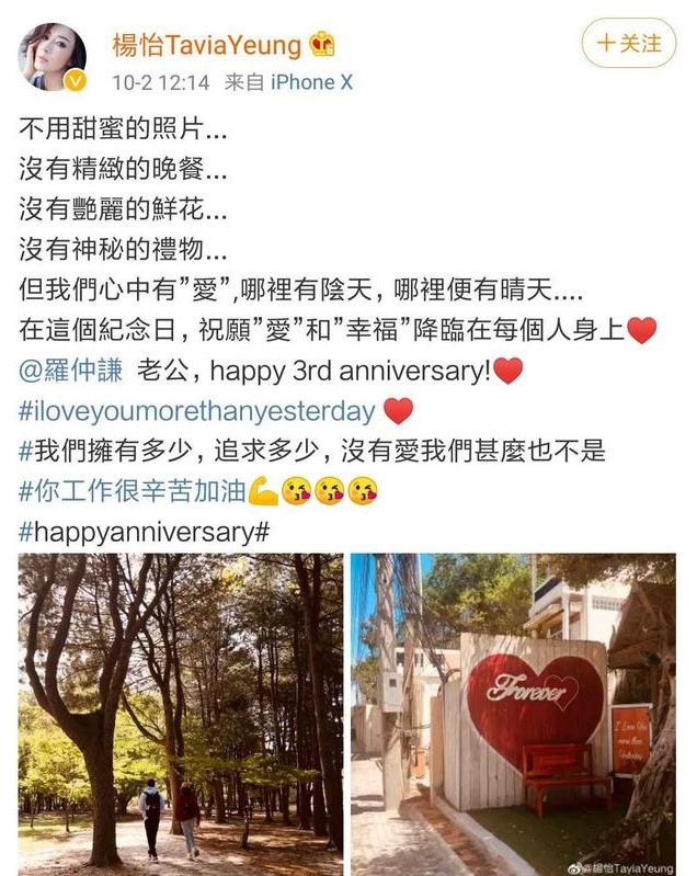 今日是罗仲谦与杨怡结婚三周年纪念日,杨怡在微博上分享了二人的旅行背影照,并温馨发文表示:「没有精致的晚餐、没有艳丽的鲜花、没有神秘的礼物,但我们心中有『爱』,哪里有阴天,哪里便有晴天,在这个纪念日,祝愿『爱』和『幸福』降临在每个人身上。老公,happy 3rd anniversary!,i love you more than yesterday,我们拥有多少,追求多少,没有爱我们什么也不是,你工作很辛苦加油。」