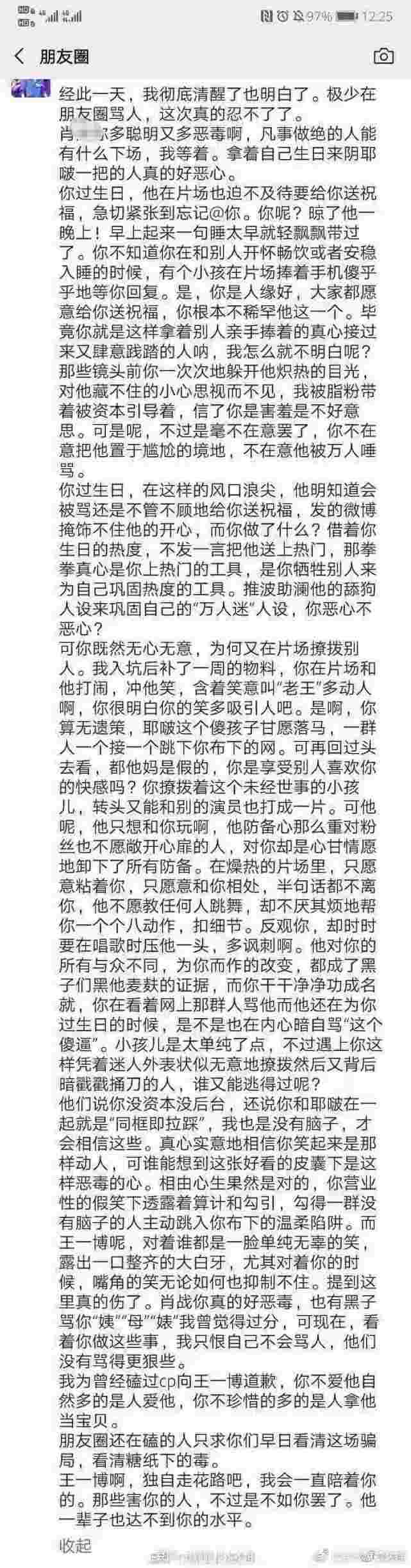 10月9日,一名看似是肖战粉丝的网友脱粉后在朋友圈发了一篇长文,通过自己的臆想责怪肖战待王一博不真诚,引起网友的热议。