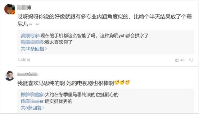 而这位电影博主有一定的影响力,微博发出之后,出现了很多不同的声音,有支持马思纯的,认为该博主是在故意惹是生非:“你说得好像就跟有多专业内涵角度似的!”“我挺喜欢马思纯的啊,她的电视剧也很棒啊!”“《大约在冬季》里马思纯演得也挺戳心的!”……