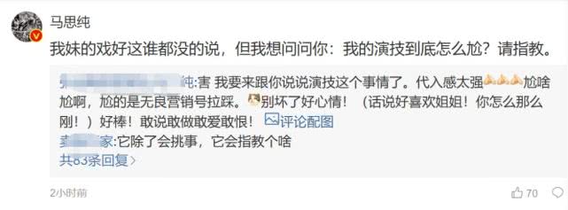看到博主看似“阴声怪气”的评论,加上褒贬不一的评价,马思纯自然是坐不住了,她直接在该博下表示:“我妹的戏好这谁都没得说,但我想问问你:我的演技到底怎么尬?请指教。”