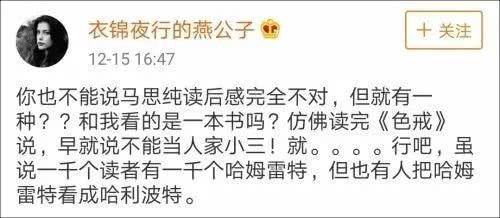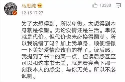 其实,这并非马思纯第一次公开怼大V,之前马思纯在微博发了一小篇有关《第一香炉》的读后感,受到自称张爱玲铁粉的嘲讽,马思纯立马回应道:“就是看完当下那一刻我本人的感觉。与你无关,所以不必讽刺。”